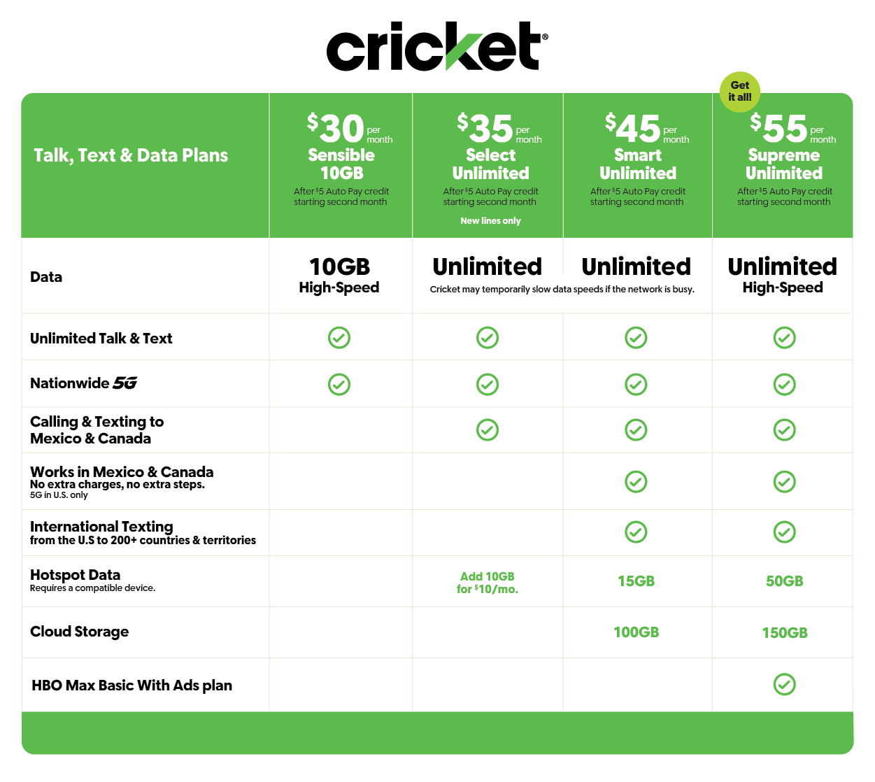 Supreme Unlimited Plan: At $55/mo. with our Auto Pay credit,2 this plan includes HBO Max with Ads,5 ramps up your connectivity with 50GB of hotspot data, and 150GB of cloud storage, plus all the great features in the Smart Unlimited™ Plan – giving you more power, more space, more freedom.